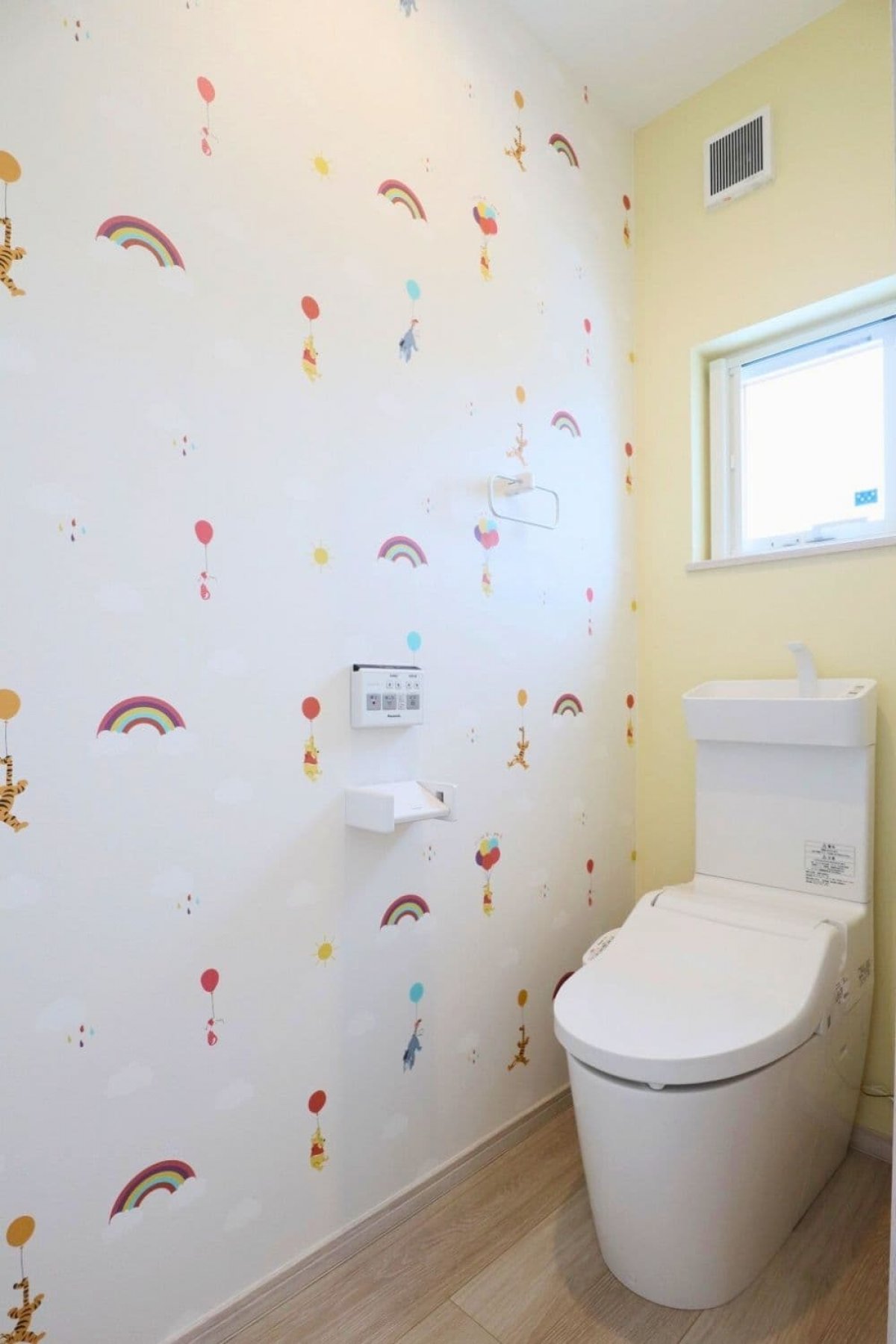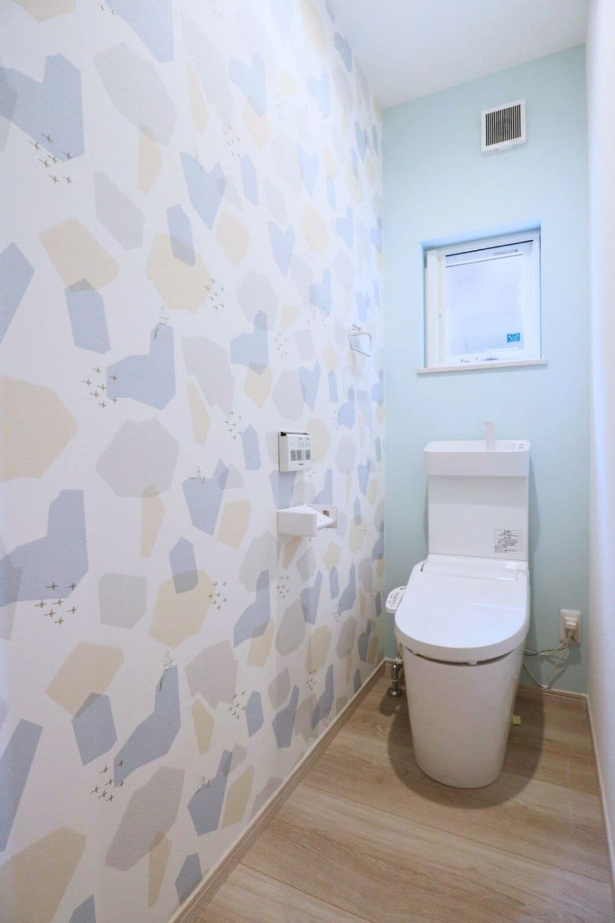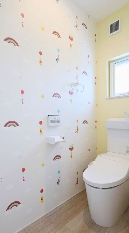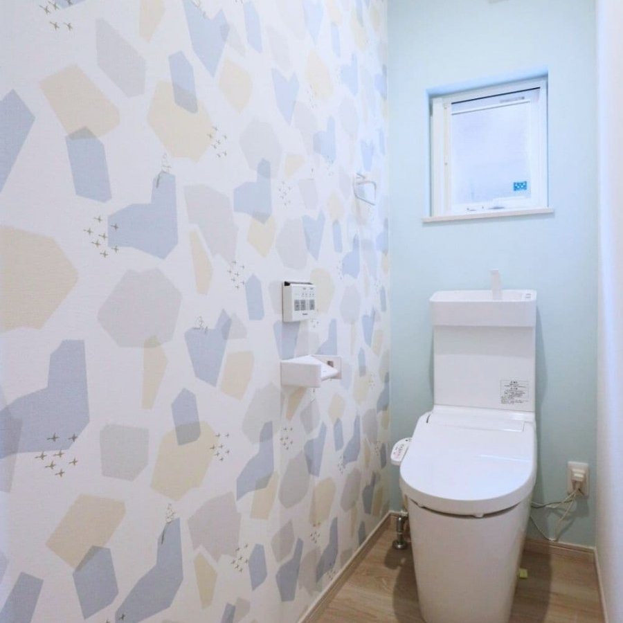毎日使うトイレは、家族が楽しめるよう個性的なアクセントクロスを取り入れたお洒落な空間ができました。