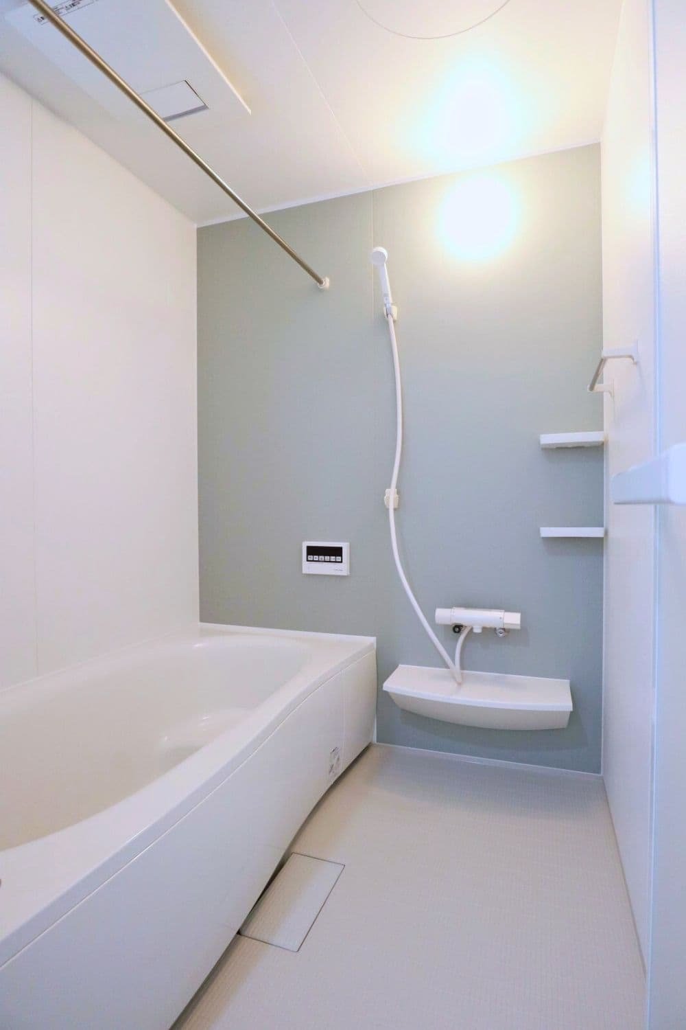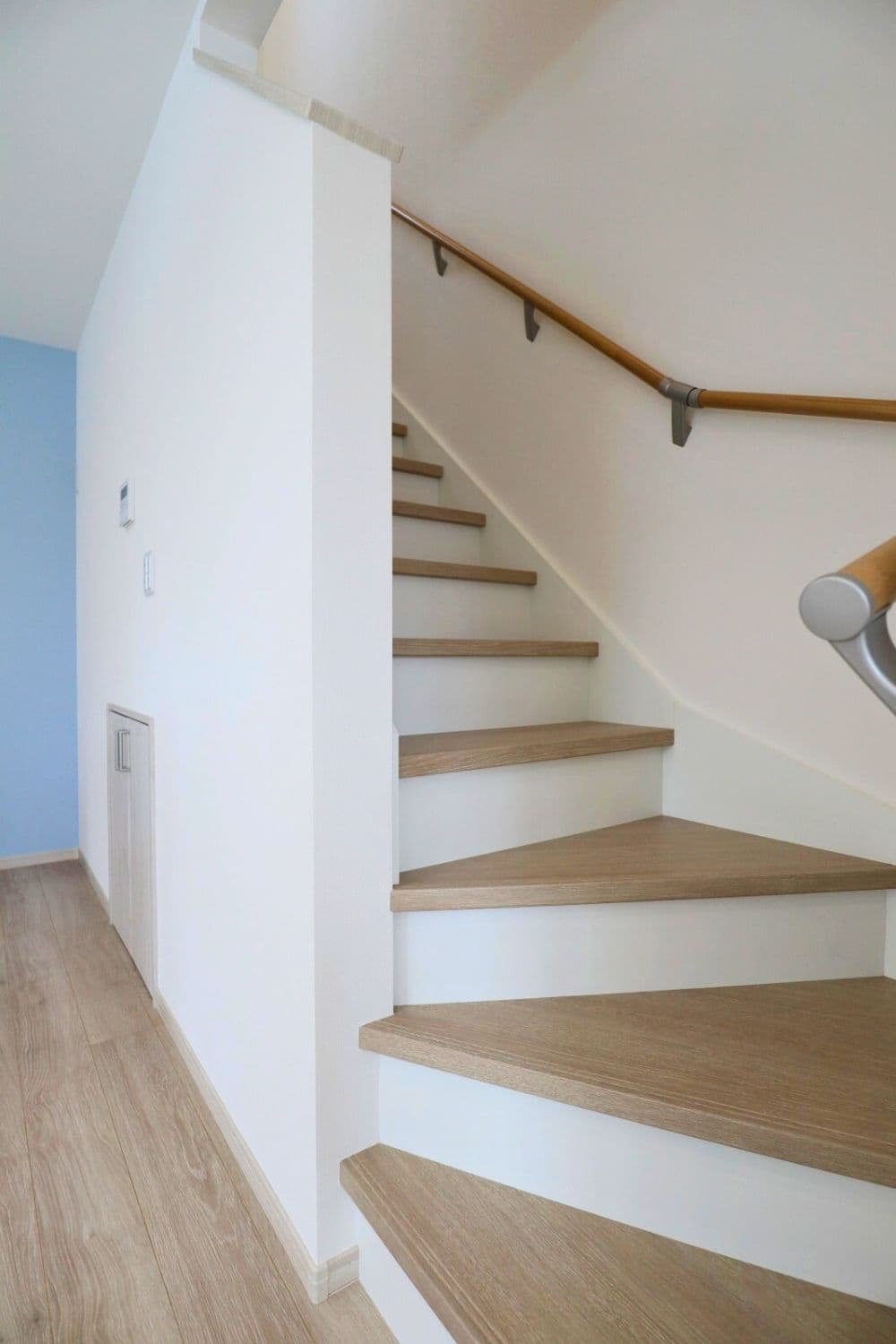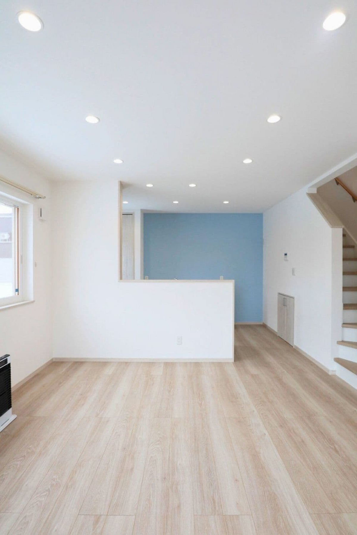 人気の高い北欧ブルーとウォッシュドオーク柄の床が見事にマッチ。淡い色味でふんわりとしたやさしい空間をつくりました。