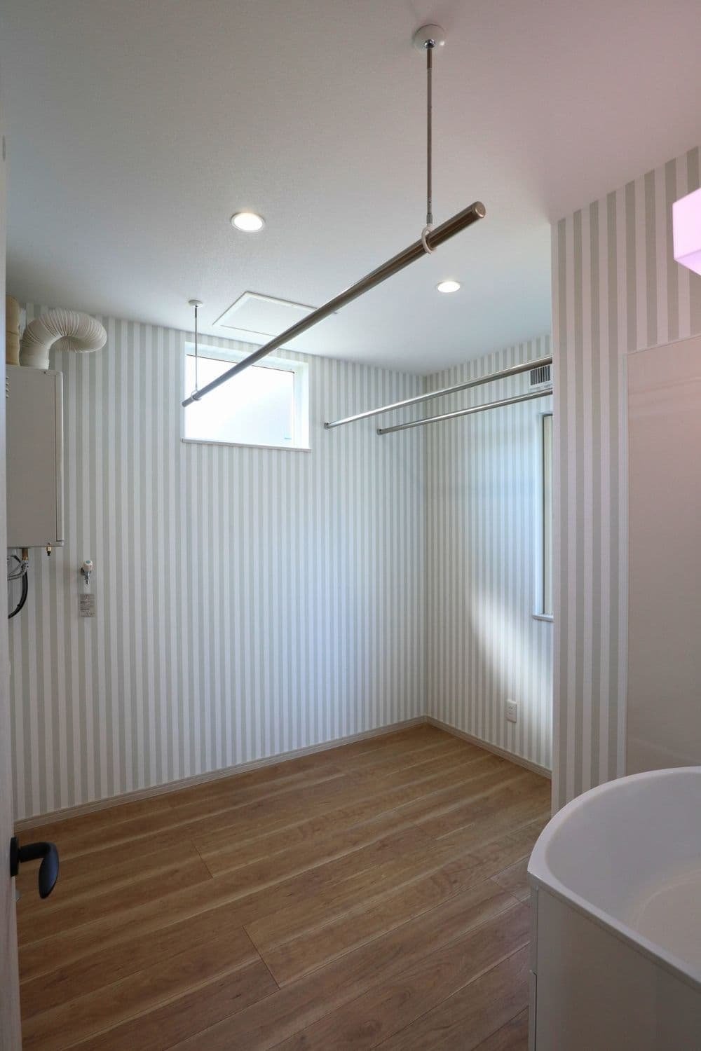 高窓から差し込む光と、爽やかなストライプの壁紙が明るい気分にさせてくれる空間。