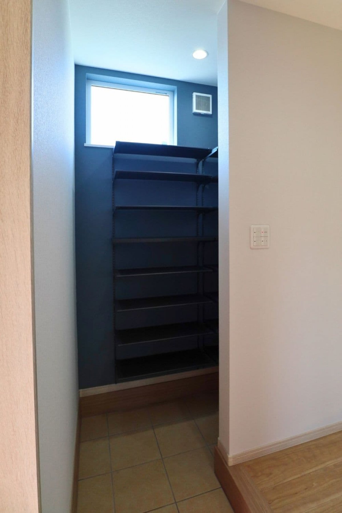 奥に配置した高窓(ハイサイドライト)から自然光が入り、暗くなりがちなシューズクロークを明るく清潔感のある空間に。