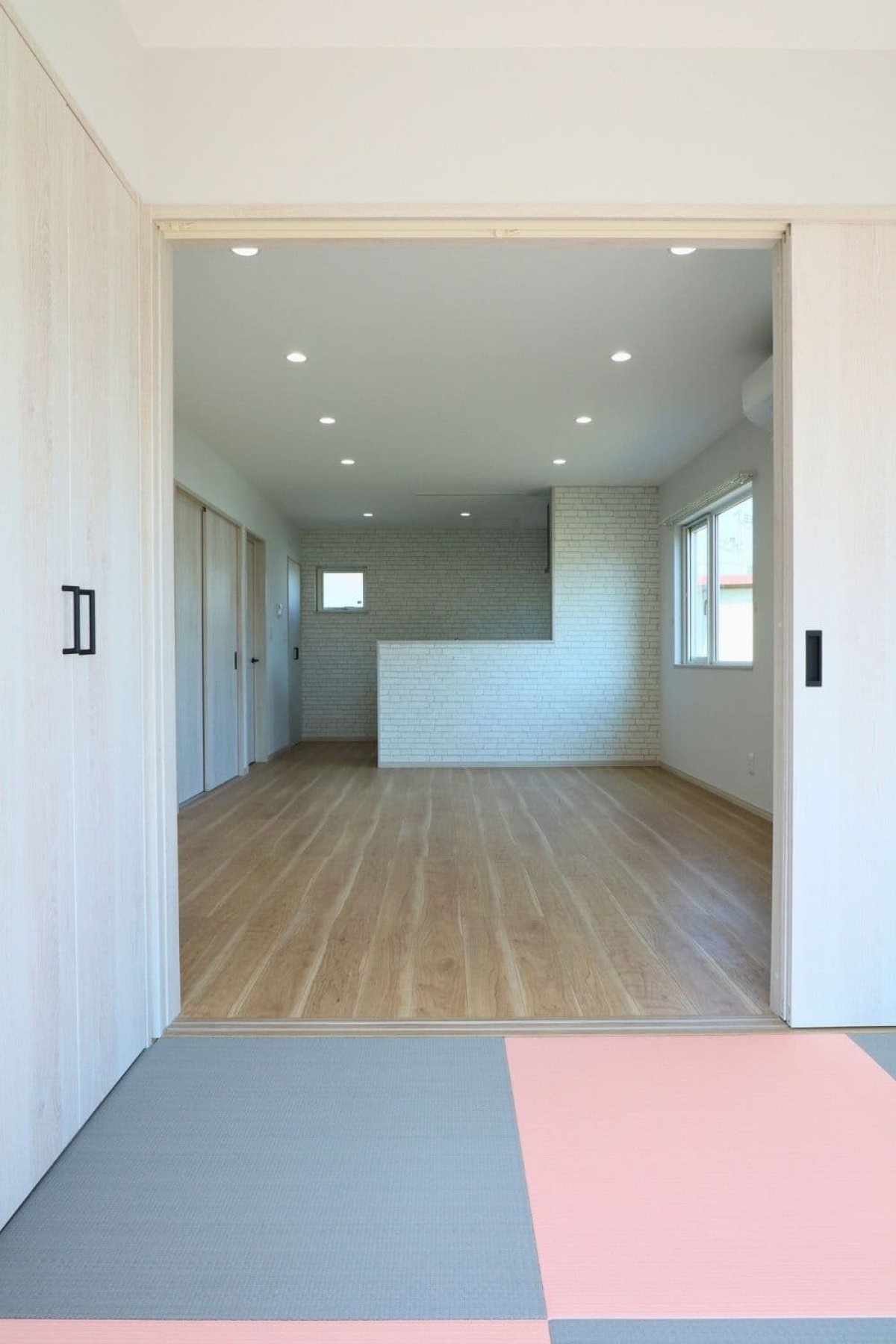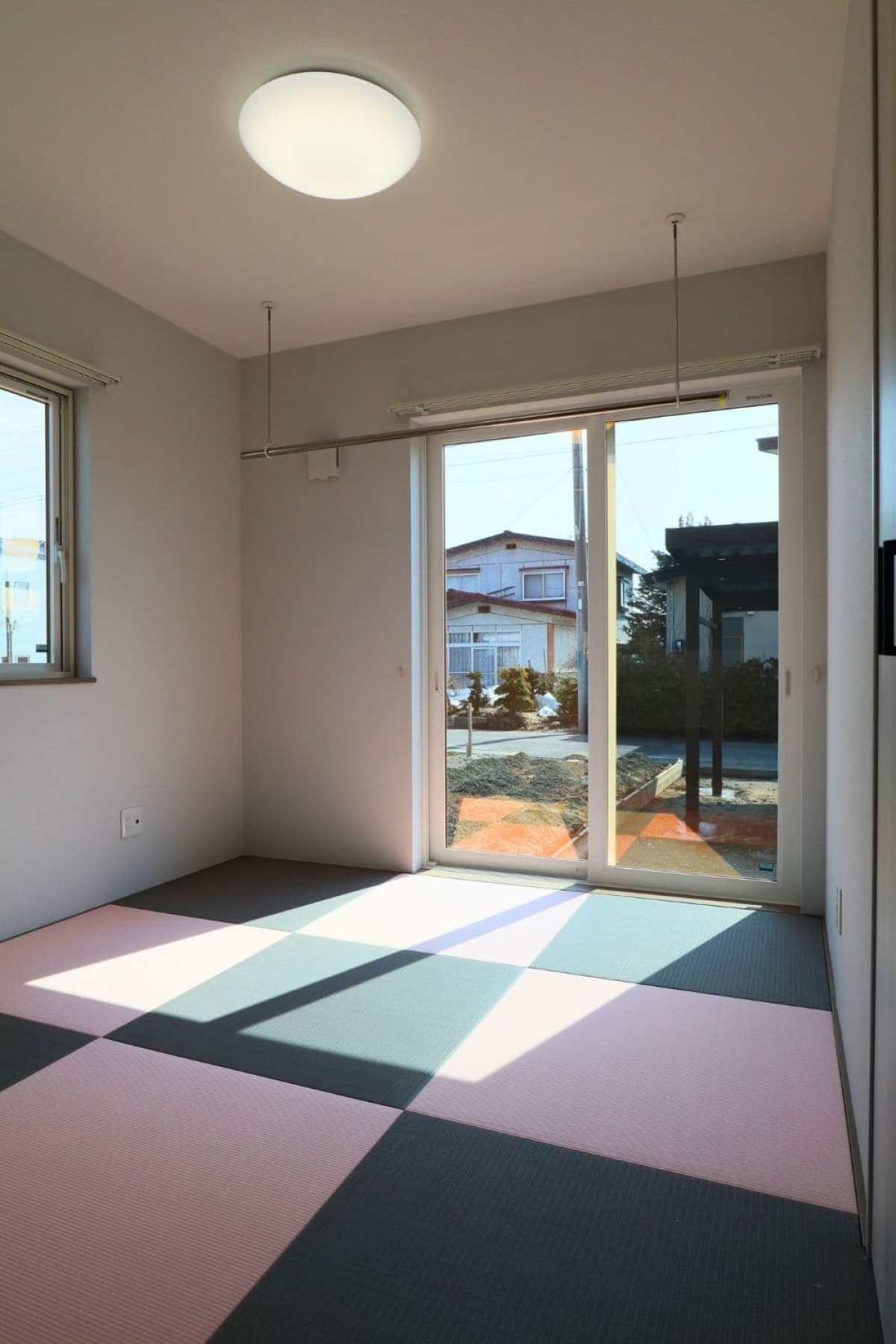 グレーとピンクの畳を組み合わせた、モダンで可愛らしい和のデザイン。