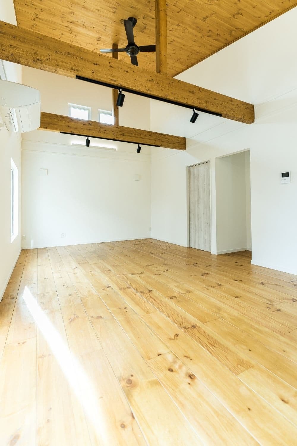 LDKは吹き抜けになってか解放感いっぱいです。 足元は無垢フロアで優しく仕上げました。 ワンフロアでの生活は家族とのコミュニケーションを活発にし 「安らぎ」を得られるあたたかな住まいです。