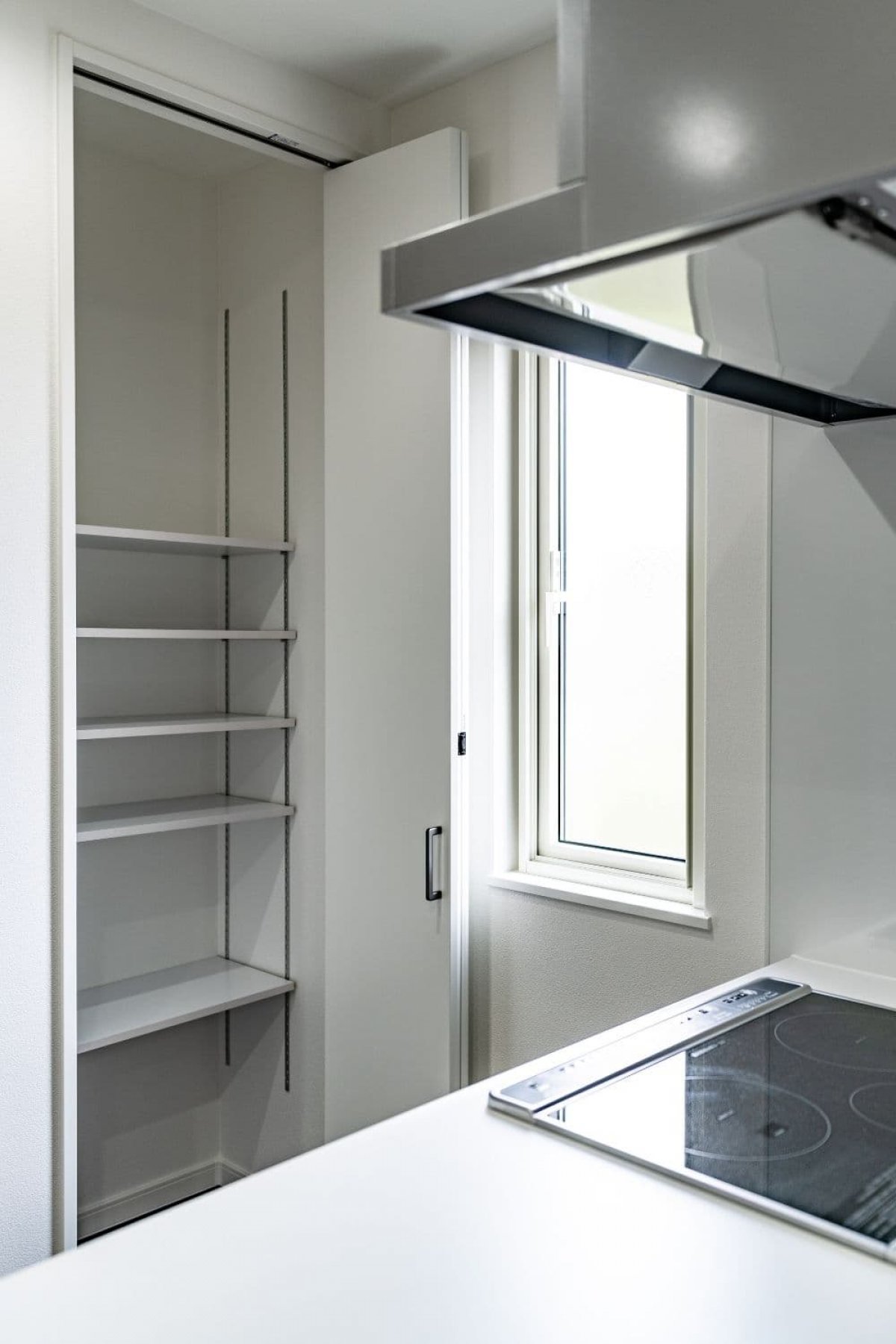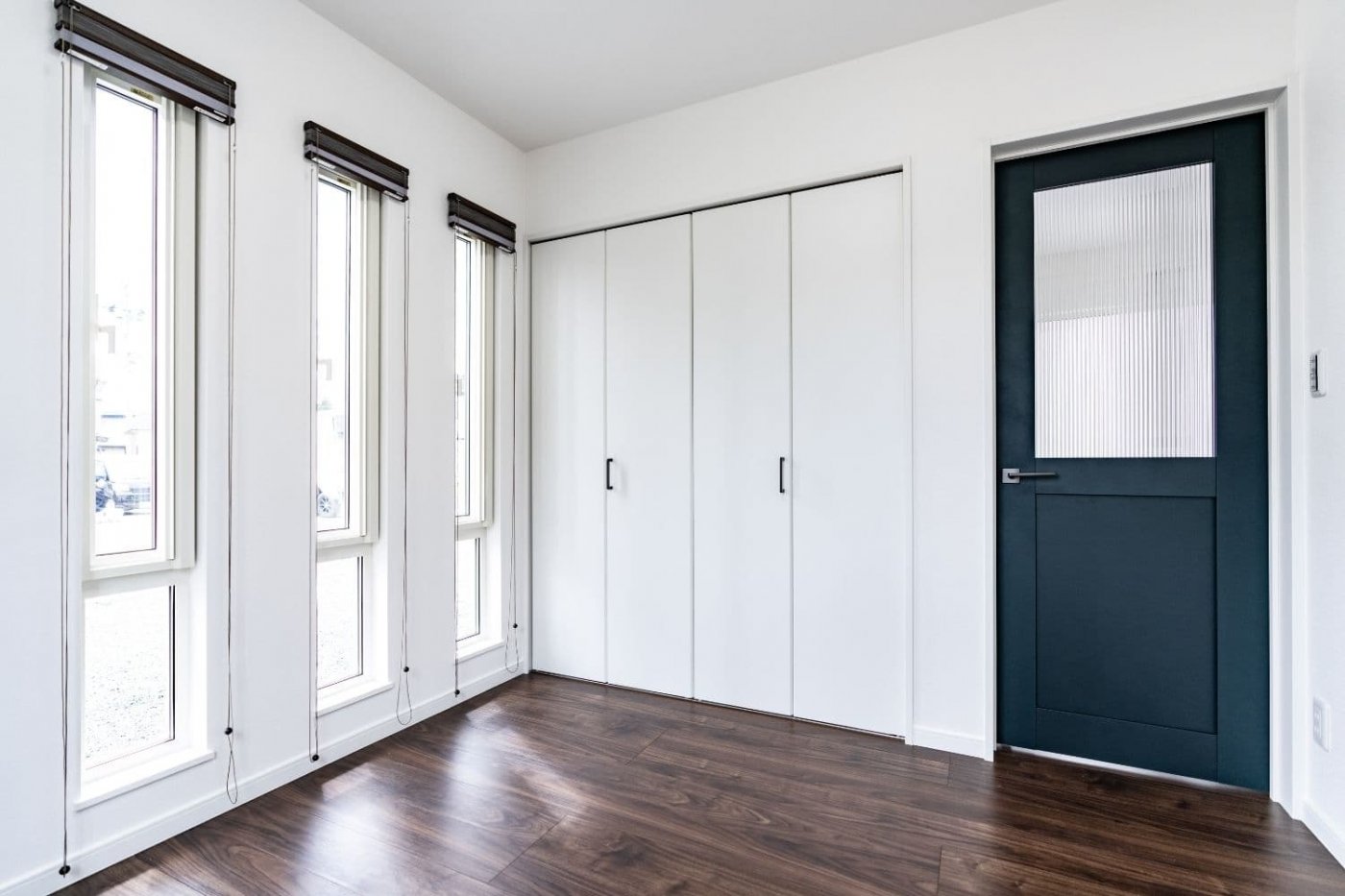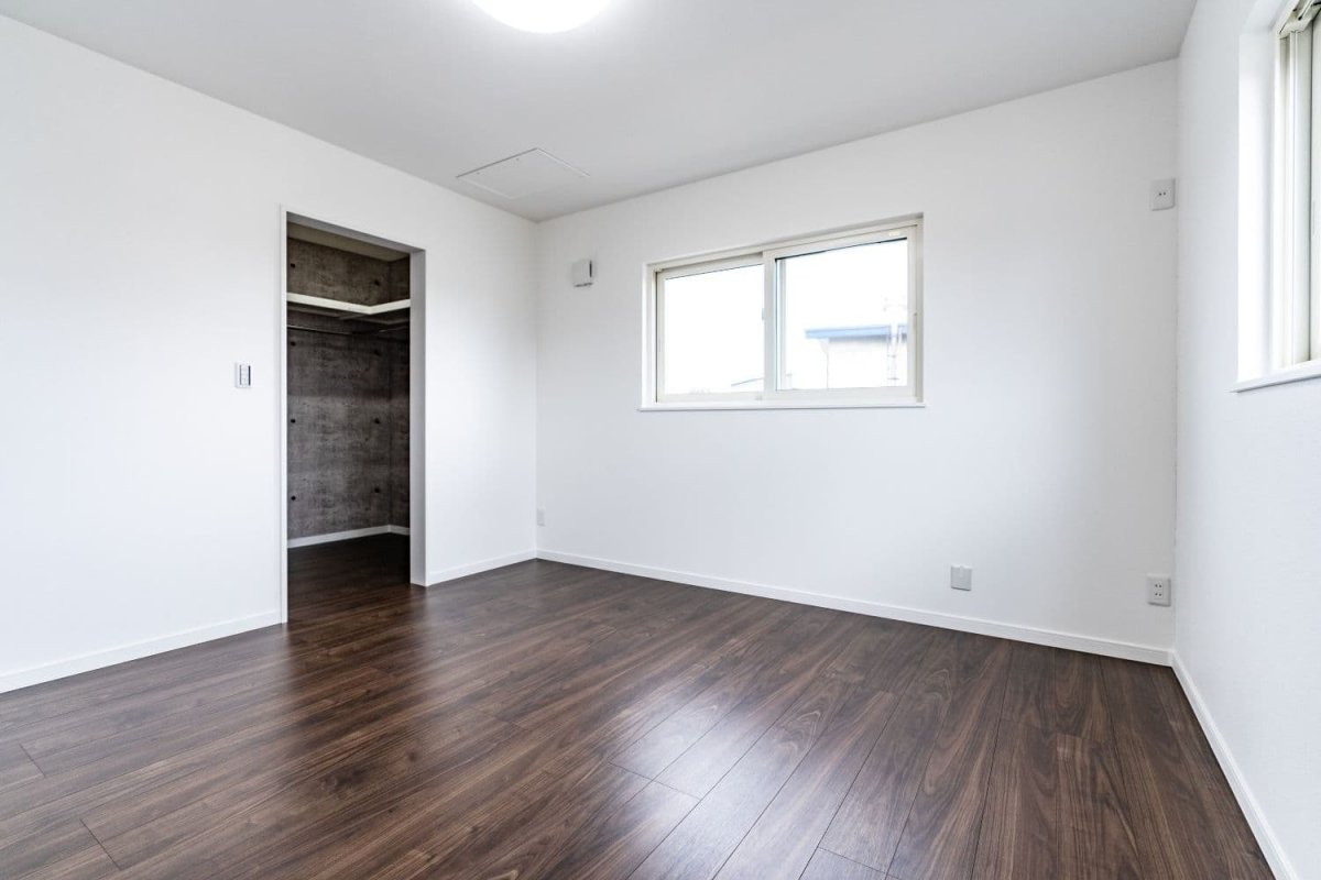 15.7帖のリビングは家族が集まる団らんに最適なスペース。 採光性を重視し見栄えも良い縦滑り窓。 1F洋室は家族が自由に使えるスペースになりました。 洗面室には便利な床下収納。 キッチンは食品庫付きで家事が楽しくなります。 2Fはシンプルな間取りで、各部屋に収納を付けました。 主寝室にはウォークインクローゼット、納戸を設置して収納も充実。