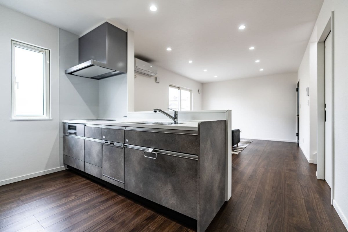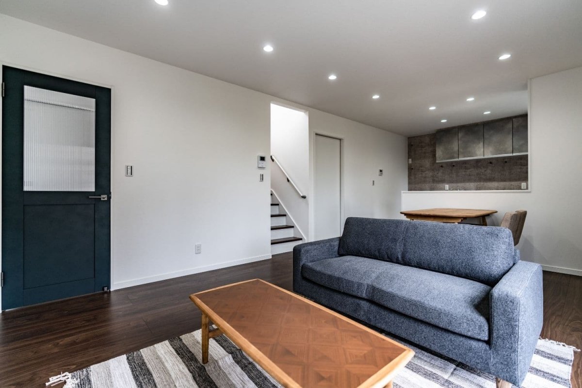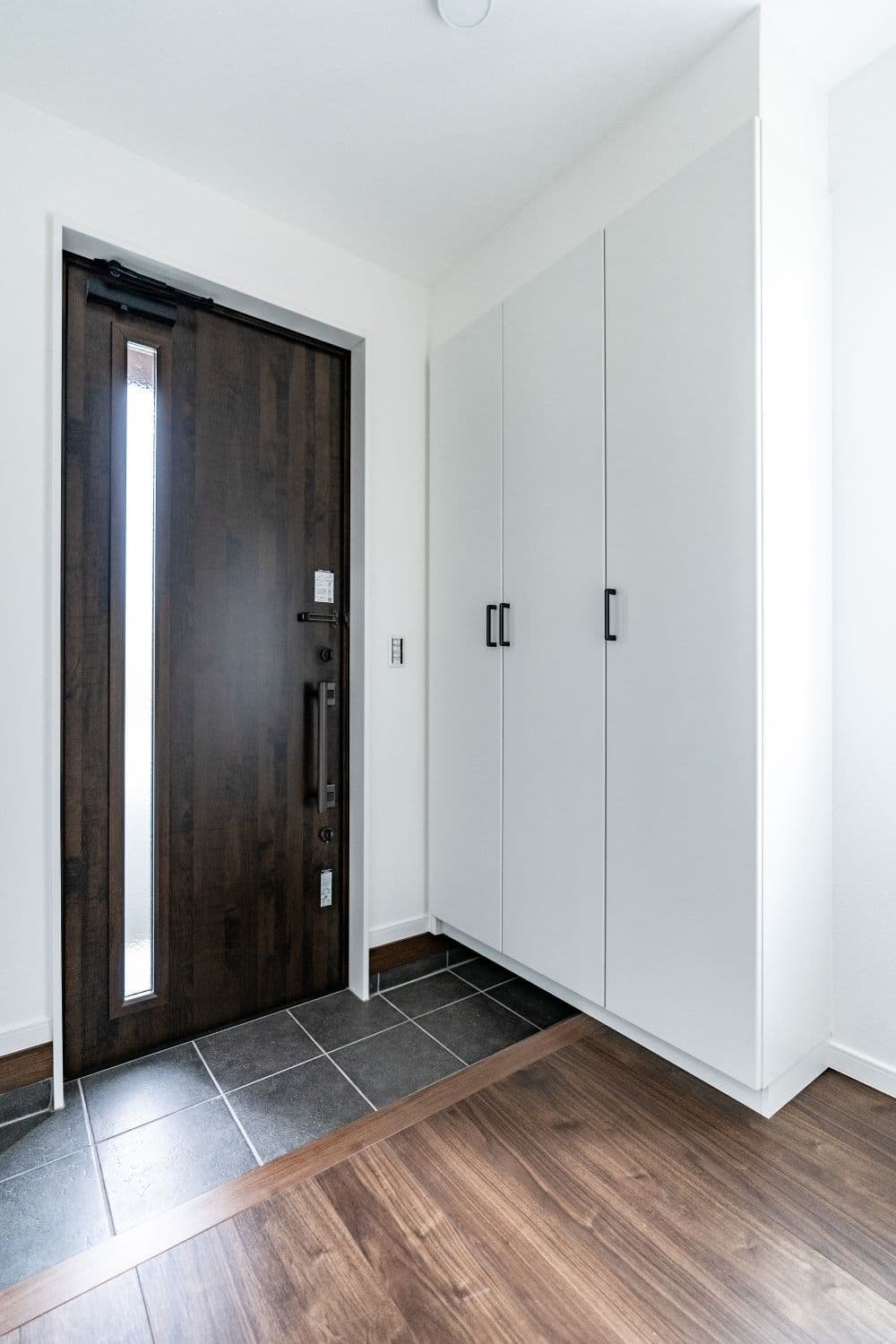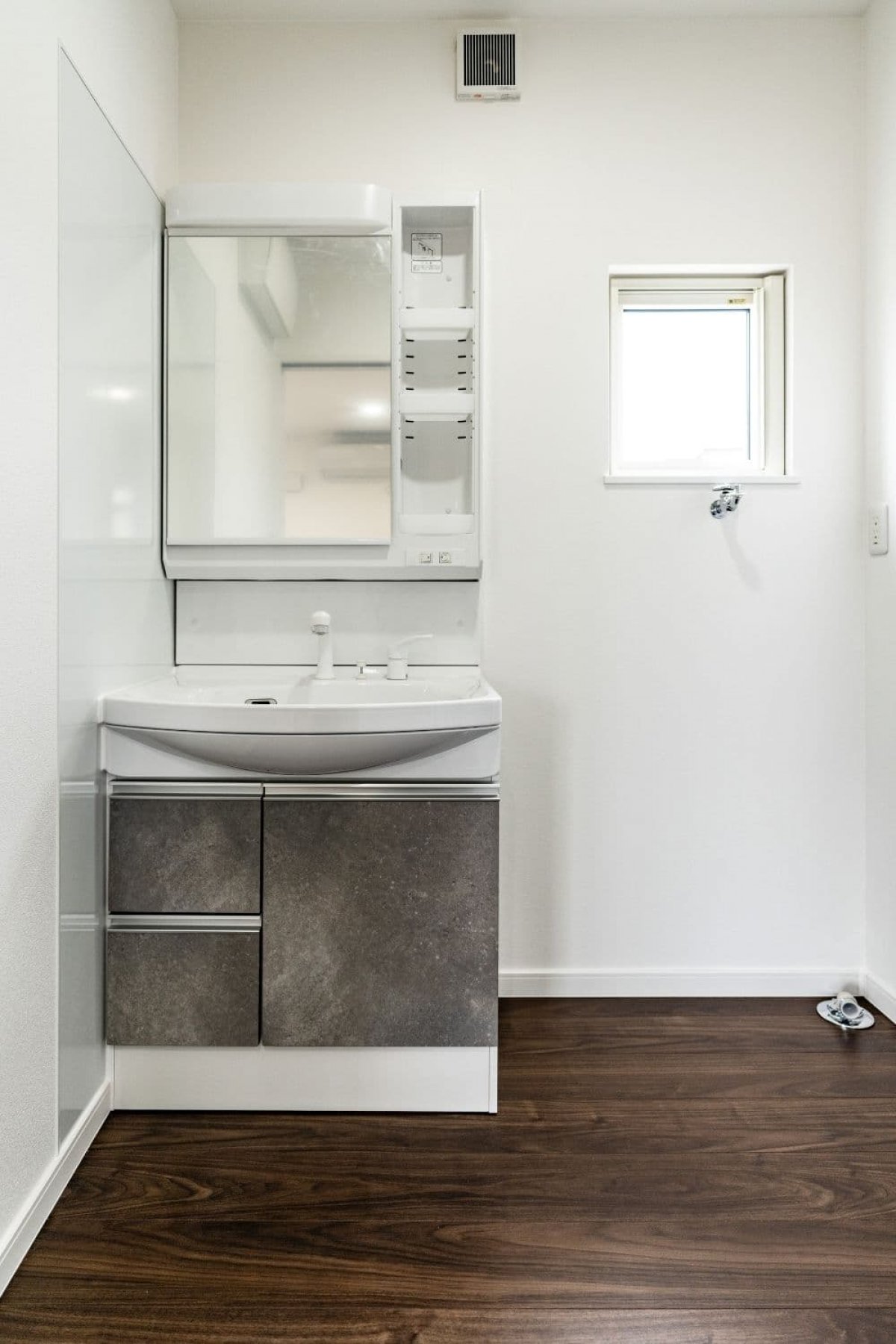 15.7帖のリビングは家族が集まる団らんに最適なスペース。 採光性を重視し見栄えも良い縦滑り窓。 1F洋室は家族が自由に使えるスペースになりました。 洗面室には便利な床下収納。 キッチンは食品庫付きで家事が楽しくなります。 2Fはシンプルな間取りで、各部屋に収納を付けました。 主寝室にはウォークインクローゼット、納戸を設置して収納も充実。