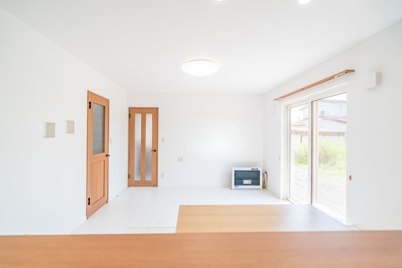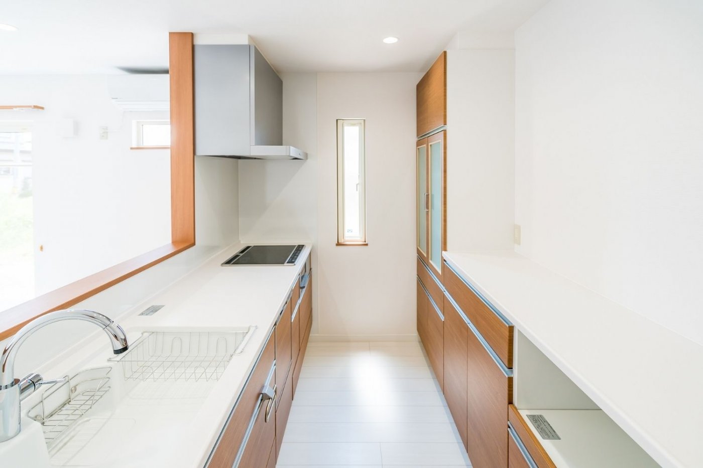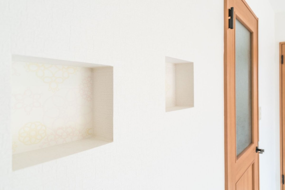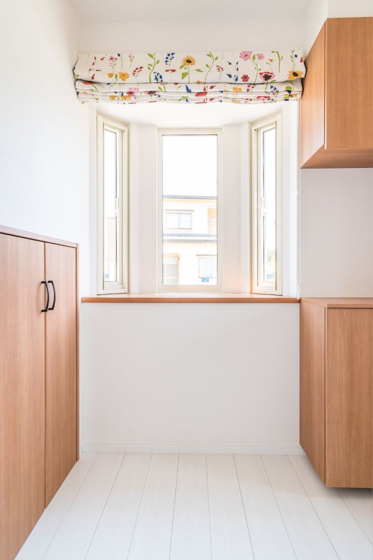 R下がりの壁の玄関ポーチ、出窓と外観もこだわりました。 小上がり、掘りごたつ、お風呂は1.25坪と広々ゆったり。 物干しポールは電動に、キッチンのニッチはくり抜きタイプ。 シンプルながらも粋な遊び心いっぱいの住宅になりました。